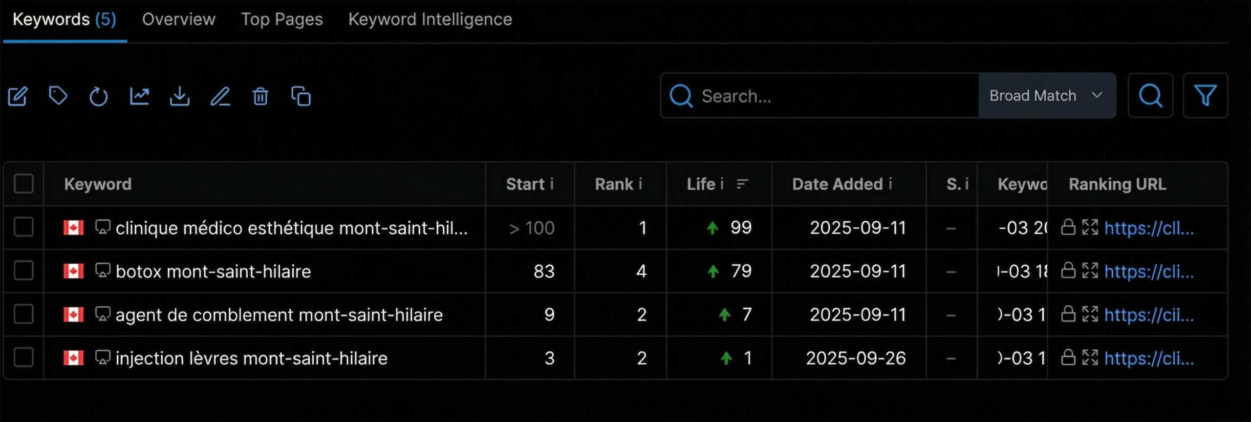 Rank #1 pour le keyword principal "clinique médico esthétique mont-saint-hilaire" avec un Life Score impressionnant de 99/100. Le site domine également avec rank #4 pour "botox" et rank #2 pour "injection lèvres" - tous atteints en 45 jours sur un site tout nouveau.