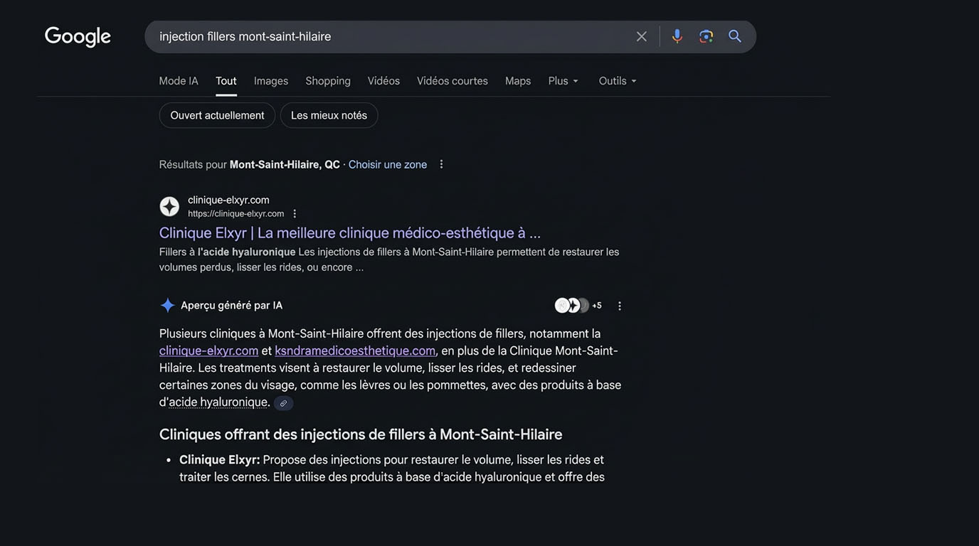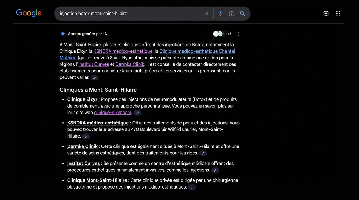 Clinique Elxyr mentionnée dans l'aperçu généré par IA de Google comme première option recommandée pour injections de Botox à Mont-Saint-Hilaire, avec lien direct vers le site web.