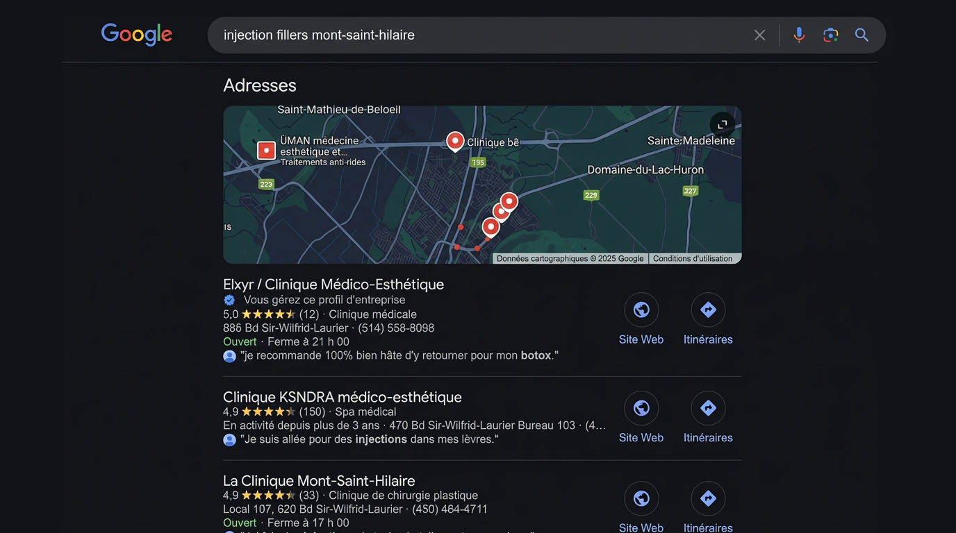 Pour "clinique médico esthétique mont-saint-hilaire", Clinique Elxyr apparaît en position #2 dans le pack local avec 5.0 étoiles, juste après une clinique sponsorisée (Institut Curves avec ads).