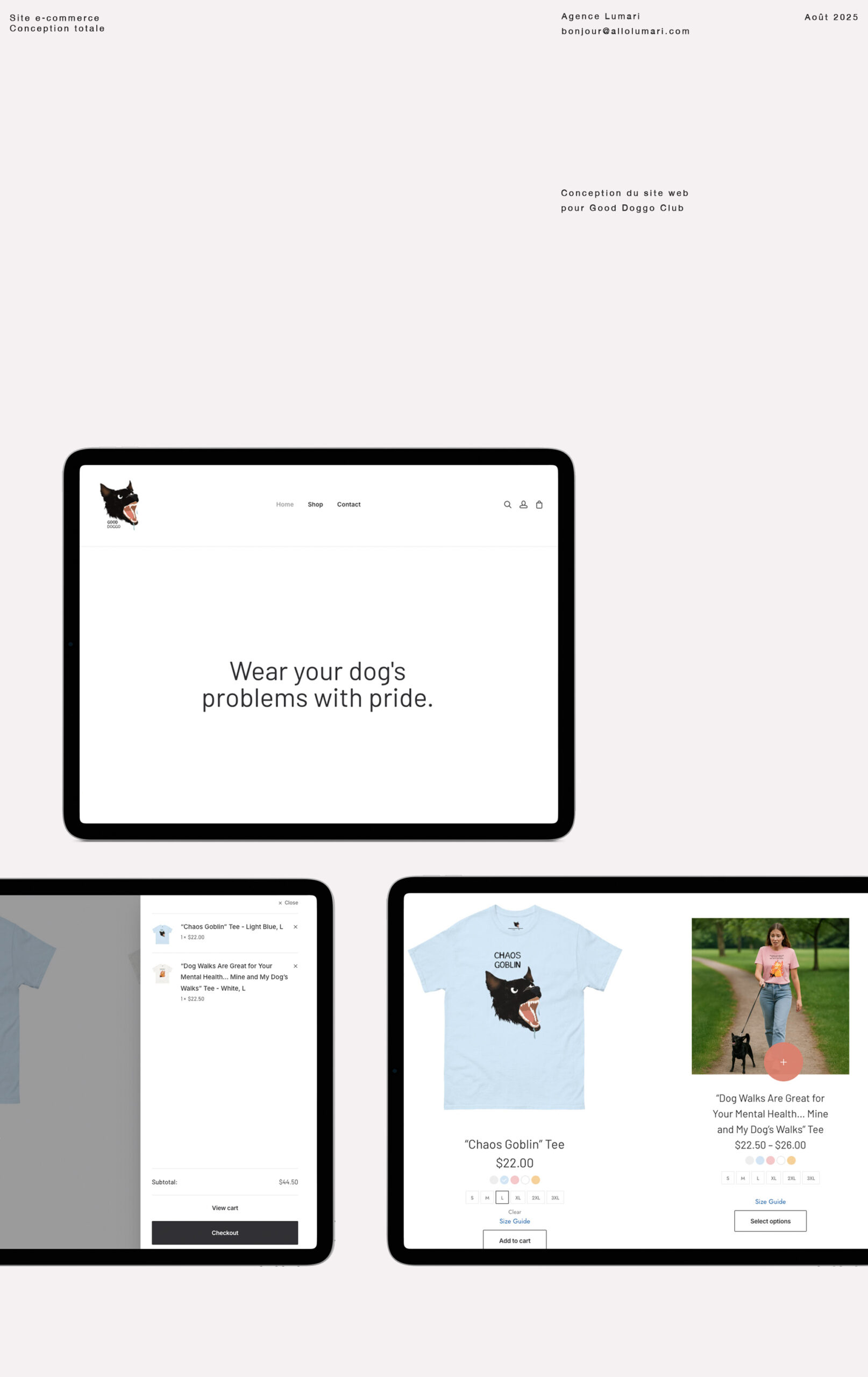 Good Doggo Club est une marque colorée et conviviale, pensée pour les amoureux des chiens, axée sur le fun, la créativité, pis une expérience e-commerce simple et engageante.